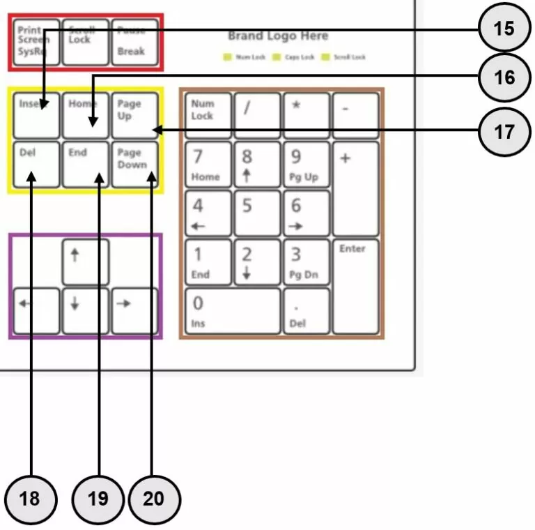 | 15 Insert / Einfg | Insert / Einfügen: Diese Taste regelt den Überschreibmodus in Textverarbeitungsprogrammen wie beispielsweise Word. |