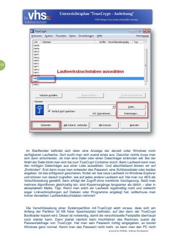Unterrichtsplan\VHS-Wirges:FrauAndreaKehrl%u00f6%u00dfer-Str%u00f6derpowered by: EURoBa Software Development13Im Startfenster befindet sich oben eine Anzeige der derzeit unter Windows noch verf%u00fcgbaren Laufwerke. Dort sucht man sich zuerst eines aus. Darunter rechts muss man sich dann entscheiden, ob man eine Datei oder einen Datentr%u00e4ger einbinden will. Bei der Wahl der Datei klickt man sich bis zum TrueCrypt Container durch. Beim Laufwerk kann man den richtigen Datentr%u00e4ger aus einer Liste ausw%u00e4hlen. Und abschlie%u00dfend klicken wir auf %u201eEinbinden%u201c. Erst dann muss man entweder das Passwort, eine Schl%u00fcsseldateioder beides angeben. Ist das erfolgreich geschehen, finden wir das neue Laufwerk im Windows Explorer und k%u00f6nnen nun darauf zugreifen, wie auf jedes andere Laufwerk auf. Hat man nur AES als Verschl%u00fcsselung gew%u00e4hlt, dann erfolgt der Zugriff ohne merkliche Verz%u00f6gerung. Setzt man mehrere Algorithmen gleichzeitig ein, sind Kopiervorg%u00e4nge langsamer als %u00fcblich %u2013aber in akzeptablem Ma%u00dfe. Tipp: Wenn man solch ein Laufwerk regelm%u00e4%u00dfig nutzt und vielleicht sogar Linkverkn%u00fcpfungen auf Dateien oder Programme angelegt hat, sollte/muss man immer denselben Laufwerksbuchstaben nehmen!Die Verschl%u00fcsselung einer Systempartition mitTrueCrypt setzt voraus, dass sich am Anfang der Partition 32 KB freier Speicherplatz befinden, auf den dann der TrueCrypt Bootloader kopiert wird. Dieser ist notwendig, damit die verschl%u00fcsselte Festplatte %u00fcberhaupt noch starten kann. Dann startet n%u00e4mlich beim Hochfahren des Rechners zuerst die Passwortabfrage von TrueCrypt. Hat man sein Passwort richtig eingegeben, so bootet Windows ganz normal. Kennt man das Passwort nicht mehr, so kann man den PC nicht