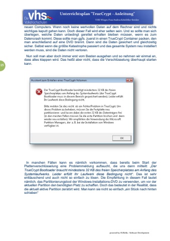 Unterrichtsplan\VHS-Wirges:FrauAndreaKehrl%u00f6%u00dfer-Str%u00f6derpowered by: EURoBa Software Development15neuen Computers. Wenn noch keine wertvollen Daten auf dem Rechner sind und nichts wichtiges kaputt gehen kann. Doch dieser Fall wird eher selten sein. Und so sollte man sich %u00fcberlegen, welche Daten unbedingt gerettet erhalten bleiben m%u00fcssen, wenn es zum Datencrash kommt. Diese sollte man ggfs. zuerst in einen TrueCrypt Container packen, den man anschlie%u00dfend auf eine DVD brennt. Dann sind die Daten gesichert und gleichzeitig sicher. Selbst wenn die gr%u00f6%u00dfte Katastrophe passiert und das gesamte System neu installiert werden muss, sind die Daten nicht verloren.Nun soll man aber doch immer erst vom Besten ausgehen und so nehmen wir einmal an, dass alles klappen wird. Das hei%u00dft aber nicht, dass die Verschl%u00fcsselung %u00fcberhaupt starten kann.In manchen F%u00e4llen kann es n%u00e4mlich vorkommen, dass bereits beim Start der Plattenverschl%u00fcsselung eine Problemmeldung auftaucht, die uns dann mitteilt: %u201eDer TrueCrypt Bootloader braucht mindestens 32 KB des freien Speicherplatzes am Anfang des Systemlaufwerks. Leider erf%u00fcllt Ihr Laufwerk diese Bedingung nicht%u201c. Das ist sehr entt%u00e4uschend und auch nicht so einfach zu l%u00f6sen. Die Empfehlung in diesem Fall lautet n%u00e4mlich, das Partitionierungstool der Windows-Installations-DVD zu verwenden, um vor der aktuellen Partition den ben%u00f6tigten Platz zu schaffen. Doch das bedeutet in der Realit%u00e4t, dass die aktuell aktive Partition zerst%u00f6rt wird. Man kann sie nicht so einfach %u201eein St%u00fcck nach hinten schieben%u201c