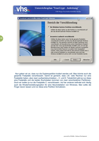 Unterrichtsplan\VHS-Wirges:FrauAndreaKehrl%u00f6%u00dfer-Str%u00f6derpowered by: EURoBa Software Development18Nun geben wir an, dass nur die Systempartition kodiert werden soll. Man k%u00f6nnte auch die gesamte Festplatte verschl%u00fcsseln. Damit ist gemeint, dass z.B. viele Rechner nur eine Festplatte haben, aber zwei Laufwerksbuchstaben %u2013C: und D: Tats%u00e4chlich gibt es nur diese eine Festplatte und die beiden Buchstaben kommen von zwei verschiedenen Partitionen. Doch wir wollen ja nur die Festplatte C: verschl%u00fcsseln. Auf der anderen befindet sich h%u00e4ufig auch die Wiederherstellungsoption f%u00fcr eine Neuinstallation von Windows. Man sollte die Finger davon lassen und nur diese eine Partition formatieren.