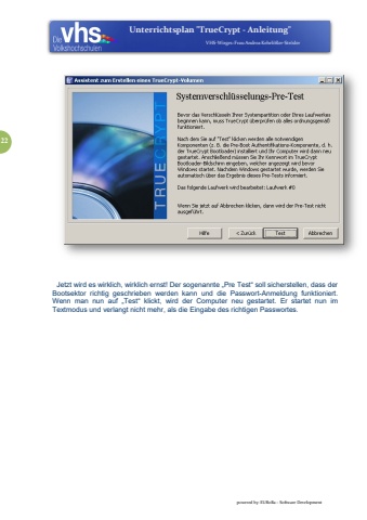 Unterrichtsplan\VHS-Wirges:FrauAndreaKehrl%u00f6%u00dfer-Str%u00f6derpowered by: EURoBa Software Development22Jetzt wird es wirklich, wirklich ernst! Der sogenannte %u201ePre Test%u201c soll sicherstellen, dass der Bootsektor richtig geschrieben werden kann und die Passwort-Anmeldung funktioniert. Wenn man nun auf %u201eTest%u201c klickt, wird der Computer neu gestartet. Er startet nun im Textmodus und verlangt nicht mehr, als die Eingabe des richtigen Passwortes.