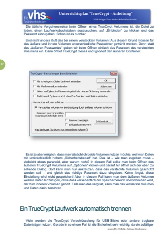 Unterrichtsplan\VHS-Wirges:FrauAndreaKehrl%u00f6%u00dfer-Str%u00f6derpowered by: EURoBa Software Development32Die %u00fcbliche Vorgehensweise beim %u00d6ffnen eines TrueCrypt Volumens ist, die Datei zu laden, einen Laufwerksbuchstaben auszusuchen, auf %u201eEinbinden%u201c zu klicken und das Passwort einzugeben. Schon ist es nutzbar.Und nicht anders l%u00e4uft das bei einem versteckten Volumen! Aus diesem Grund m%u00fcssen f%u00fcr das %u00e4u%u00dfere und innere Volumen unterschiedliche Passw%u00f6rter gew%u00e4hlt werden. Denn statt des %u201e%u00e4u%u00dferen Passwortes%u201c geben wir beim %u00d6ffnen einfach das Passwort des versteckten Volumens ein. Dann %u00f6ffnet TrueCrypt dieses und ignoriert den %u00e4u%u00dferen Container.Es ist ja aber m%u00f6glich, dass man tats%u00e4chlich beide Volumen nutzen m%u00f6chte, weil man Daten mit unterschiedlich hohem %u201eSicherheitsbedarf%u201c hat. Das ist %u2013wie man zugeben muss %u2013vielleicht etwas paranoid, aber warum nicht? In diesem Fall sollte man beim %u00d6ffnen des %u00e4u%u00dferen TrueCrypt Volumens auf %u201eOptionen%u201c klicken und darauf hin %u00f6ffnet sich der oben zu sehende Dialog. Dort kann man nun ankreuzen, dass das versteckte Volumen gesch%u00fctzt werden soll %u2013und gleich das richtige Passwort dazu eingeben. Keine Angst, diese Einstellung wird nicht gespeichert! Aber in diesem Fall kann man dem %u00e4u%u00dferen Volumen weitere Daten hinzuf%u00fcgen, ohne dass versehentlich der Speicherbereich %u00fcberschrieben wird, der zum inneren Volumen geh%u00f6rt. Falls man das vergisst, kann man das versteckte Volumen und Daten darin zerst%u00f6ren.Ein TrueCrypt Laufwerk automatisch trennenViele werden die TrueCrypt Verschl%u00fcsselung f%u00fcr USB-Sticks oder andere tragbare Datentr%u00e4ger nutzen. Gerade in so einem Fall ist die Sicherheit sehr wichtig, da ein zuf%u00e4lliger