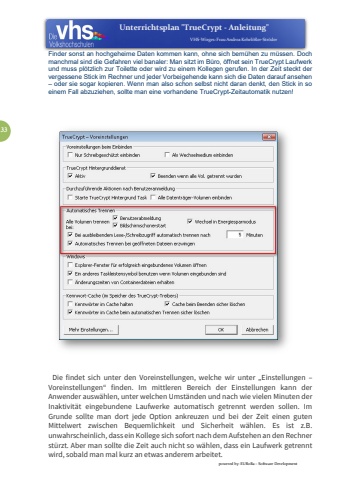 Unterrichtsplan\VHS-Wirges:FrauAndreaKehrl%u00f6%u00dfer-Str%u00f6derpowered by: EURoBa Software Development33Finder sonst an hochgeheime Daten kommen kann, ohne sich bem%u00fchen zu m%u00fcssen. Doch manchmal sind die Gefahren viel banaler: Man sitzt im B%u00fcro, %u00f6ffnet sein TrueCrypt Laufwerk und muss pl%u00f6tzlich zur Toilette oder wird zu einem Kollegen gerufen. In der Zeit steckt der vergessene Stick im Rechner und jeder Vorbeigehende kann sich die Daten darauf ansehen %u2013oder sie sogar kopieren. Wenn man also schon selbst nicht daran denkt, den Stick in so einem Fall abzuziehen, sollte man eine vorhandene TrueCrypt-Zeitautomatik nutzen!Die findet sich unter den Voreinstellungen, welche wir unter %u201eEinstellungen %u2013Voreinstellungen%u201c finden. Im mittleren Bereich der Einstellungen kann der Anwender ausw%u00e4hlen, unter welchen Umst%u00e4nden und nach wie vielen Minuten der Inaktivit%u00e4t eingebundene Laufwerke automatisch getrennt werden sollen. Im Grunde sollte man dort jede Option ankreuzen und bei der Zeit einen guten Mittelwert zwischen Bequemlichkeit und Sicherheit w%u00e4hlen. Es ist z.B. unwahrscheinlich, dass ein Kollege sich sofort nach dem Aufstehen an den Rechner st%u00fcrzt. Aber man sollte die Zeit auch nicht so w%u00e4hlen, dass ein Laufwerk getrennt wird, sobald man mal kurz an etwas anderem arbeitet.