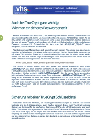 Unterrichtsplan\VHS-Wirges:FrauAndreaKehrl%u00f6%u00dfer-Str%u00f6derpowered by: EURoBa Software Development5Auch bei TrueCrypt ganz wichtig:Wie man ein sicheres Passwort erstelltSichere Passw%u00f6rter sind das A und O bei jedem digitalen Schutz. Namen, Geburtsdaten und allgemeine Begriffe sind dumm. Ein Passwort sollte eine gewisse Mindestl%u00e4nge haben. 15 bis 20 Zeichen sind empfehlenswert. Au%u00dferdem sollte es aus allen m%u00f6glichen Zeichen bestehen, die man mit seiner Tastatur erreichen kann in Gro%u00df-und Kleinschreibung. W%u00e4hrend also das Passwort %u201esusanne123%u201c Schwachsinn ist, kann man bei %u201e#G5$}fUk%u00e4*_%u00b2f9|o0>P%u201c davon ausgehen, dass es niemand erraten wird.Aber kein normaler Mensch kann sich so ein Passwort merken. Also w%u00fcrde man es entweder irgendwo aufschreiben %u2013oder etwas einfacheres nehmen. Und an dieser Stelle kann man gut mit einem Trick arbeiten. Zuerst sucht man sich einen Merksatz aus, der einem immer wieder einf%u00e4llt und den man notfalls sogar nachschlagen kann. Beispielsweise den ersten Satz auf Seite 100 seines Lieblingsbuches. Bei mir w%u00e4re das etwa:Meine G%u00fcte, sagte Tilden, Du bist gut vorbereitet, Oberfeldwebel.Von diesen 9 Worten nimmt man jetzt jeweils den ersten Buchstaben und erh%u00e4lt: %u201eMGsTDbgvO%u201c.Das allein ist schon nicht schlecht. Aber jetzt mische ich noch eine (in diesem Fall hypothetische) Telefonnummer rein. Immer abwechselnd Nummer, Buchstabe, Nummer, Buchstabe%u2026 Und es entsteht: %u201e9M5G2s6T3D0b6g4v2O%u201c. Um die ganze Sache abzurunden, jetzt noch eine Raute nach vorn und einen Stern hinten dran: %u201e#9M5G2s6T3D0b6g4v2O*%u201cund fertig ist ein Passwort, an dem sich selbst Superrechner f%u00fcr ein paar Tausend Jahre die digitalen Z%u00e4hne ausbei%u00dfen w%u00fcrden. Und das Gute daran: Da es aus einem Satz besteht, denman sich leicht merken kann und der Telefonnummer, die man auch nicht vergisst, muss man es nicht aufschreiben. Das ist bereits selbstgemachte Verschl%u00fcsselungstechnik in ihrer einfachsten Form!Sicherung mit einer TrueCrypt Schl%u00fcsseldateiPassw%u00f6rter sind eine Methode, um TrueCrypt-Verschl%u00fcsselungen zu sichern. Die andere Methode sind die Schl%u00fcsseldateien, auch Keyfiles genannt. Dabei nutztTrueCrypt beliebige Dateien als Schl%u00fcssel f%u00fcr die Laufwerke. Das k%u00f6nnen PDFs oder MP3-Dateien sein, aber auch Bilder, Textdateien oder irgendwelche Word-bzw. Excel-Dokumente. Eben jede Art von Daten. Und es ist auch egal, wo sie liegen. Nur der Besitzer sollte sich merken, wo er die Dateien hingelegt hat und er darf sie nachtr%u00e4glich nicht mehr ver%u00e4ndern. Denn als Schl%u00fcssel gelten dann nur eine oder mehrere Dateien in genau dem Zustand, in dem sie das erste Mal als Schl%u00fcssel genutzt wurden.