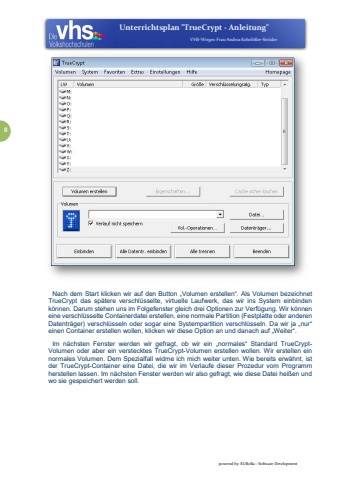 Unterrichtsplan\VHS-Wirges:FrauAndreaKehrl%u00f6%u00dfer-Str%u00f6derpowered by: EURoBa Software Development8Nach dem Start klicken wir auf den Button %u201eVolumen erstellen%u201c. Als Volumen bezeichnet TrueCrypt das sp%u00e4tere verschl%u00fcsselte, virtuelle Laufwerk, das wir ins System einbinden k%u00f6nnen. Darum stehen uns im Folgefenster gleich drei Optionen zur Verf%u00fcgung. Wir k%u00f6nnen eine verschl%u00fcsselte Containerdatei erstellen, eine normale Partition (Festplatte oder anderen Datentr%u00e4ger) verschl%u00fcsseln oder sogar eine Systempartition verschl%u00fcsseln. Da wir ja %u201enur%u201c einen Container erstellen wollen, klicken wir diese Option an und danach auf %u201eWeiter%u201c.Im n%u00e4chsten Fenster werden wir gefragt, ob wir ein %u201enormales%u201c Standard TrueCryptVolumen oder aber ein verstecktes TrueCrypt-Volumen erstellen wollen. Wir erstellen ein normales Volumen. Dem Spezialfall widme ich mich weiter unten. Wie bereits erw%u00e4hnt, ist der TrueCrypt-Container eine Datei, die wir im Verlaufe dieser Prozedur vom Programm herstellen lassen. Im n%u00e4chsten Fenster werden wir also gefragt, wie diese Datei hei%u00dfen und wo sie gespeichert werden soll.